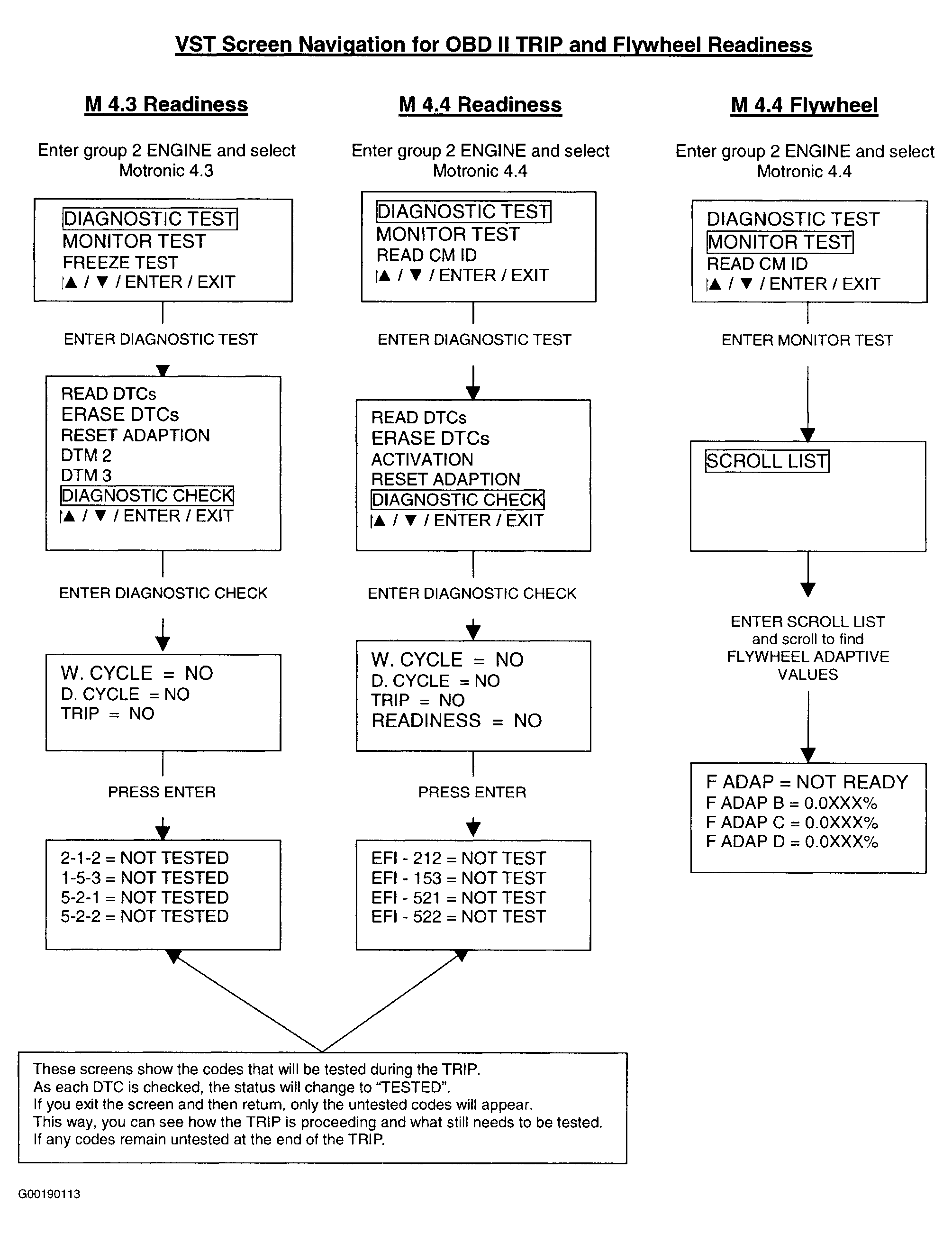 Fig 1: Screen Displays During TRIP Cycle, Flywheel Adaptation & Readiness Code Testing