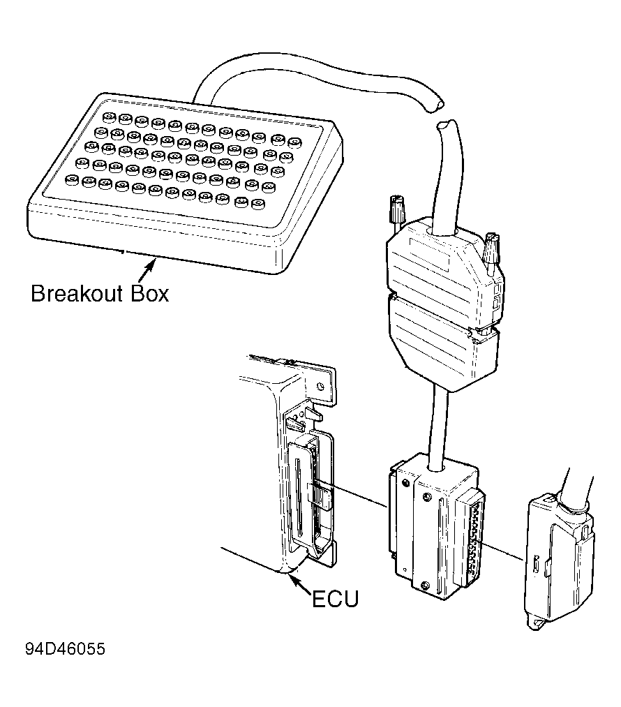 Ensure ignition is off. Install breakout box and adapter. See Figure. Connect adapter connector "A" to breakout box. Measure voltage between breakout box terminal No. 13 (ground) and terminals No. 12, 26 and 27. Battery voltage should be present at all terminals. If voltage is not as specified, check No. 1 fuse, wiring and main relay. Repair as necessary.
