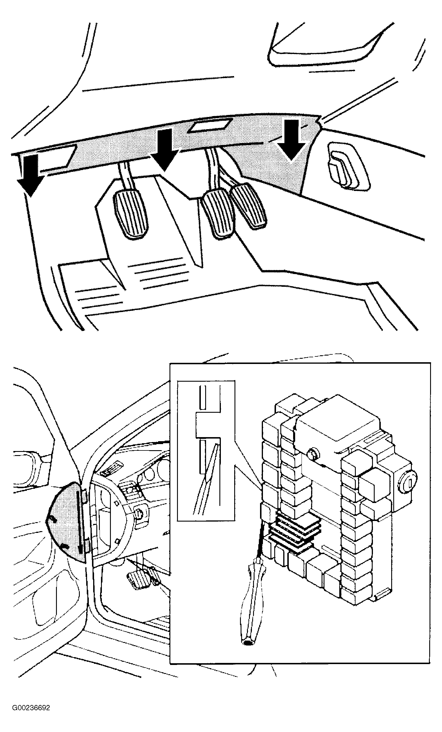 1. Remove insulation panel on driver side. Panel sits in grooves at pedal box. Pull panel straight down at dashboard and then pull backward. Lift panel out. Remove side panel covering fuses on left side of dash. Insert a screwdriver between bracket and relay box and turn to open bracket. Pull relay box out of bracket toward underside of dash and lift box off bracket. Pull relay box out under dash. See Fig 1.