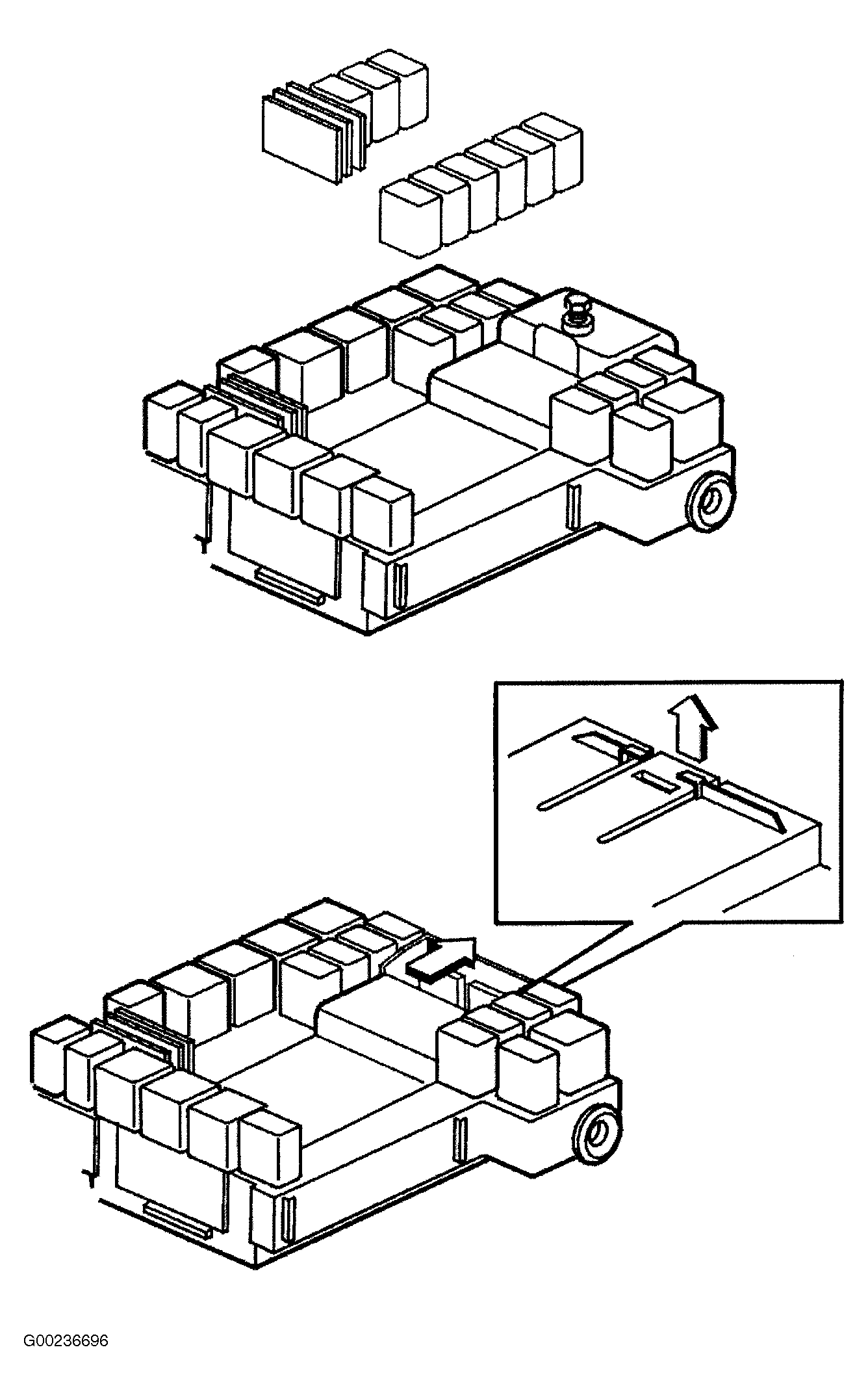 4. Remove relays and shunts attached to control module. Record each location. Release catch at rear. Use a screwdriver to lift catch and pull out control module. See Fig 2.