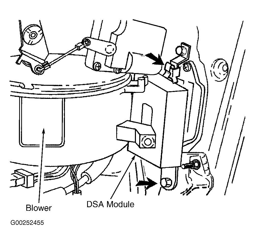 Dynamic Stability Assistance (DSA) Control Module is located under right side A-pillar trim next to blower fan. Remove trim and mounting bolt to remove module. Reverse procedure to install. See Fig 1.