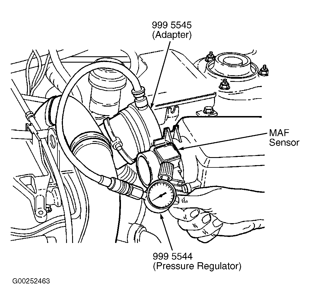- Disconnect fresh air intake hose from Mass Air Flow (MAF) sensor. Connect Adapter (999-5545) and Pressure Regulator (999-5544) to intake hose. See Fig 1. Seal crankcase ventilation hose using a hose clip and remove oil filler cap. See Fig 2. Disconnect lower hose from canister purge valve.