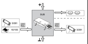 The table below summarizes the input signals to and output signals from the Subwoofer module (SUB). The signal types are divided into directly connected signals and MOST communication. Fig 1 displays the same information with the Volvo component designations.
