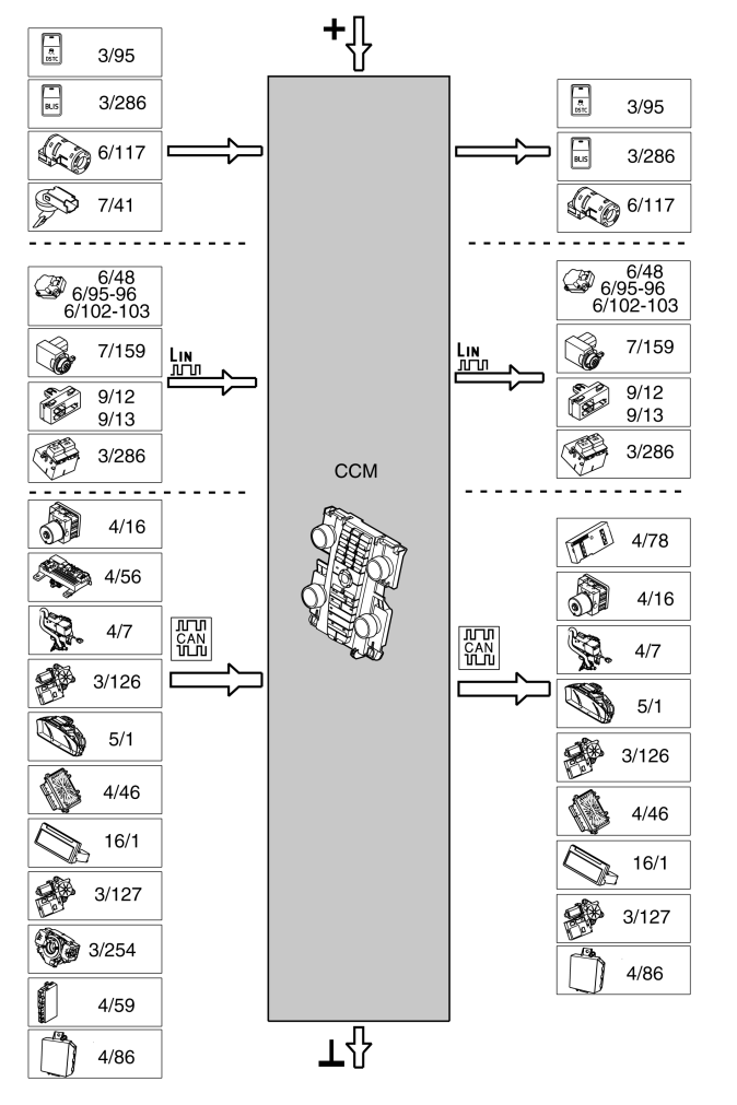 The table below summarizes the input signals to and output signals from the climate control module (CCM). The signal types are divided into directly connected signals, LIN and CAN communication. The illustration (see Fig 1) displays the same information with the Volvo component designations.