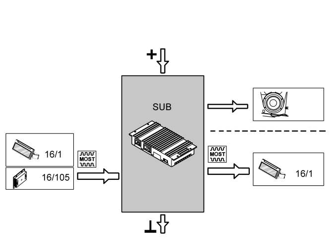 The table below summarizes the input signals to and output signals from the Subwoofer module (SUB). The signal types are divided into directly connected signals and MOST communication. The illustration below (Fig 1) displays the same information with the Volvo component designations.