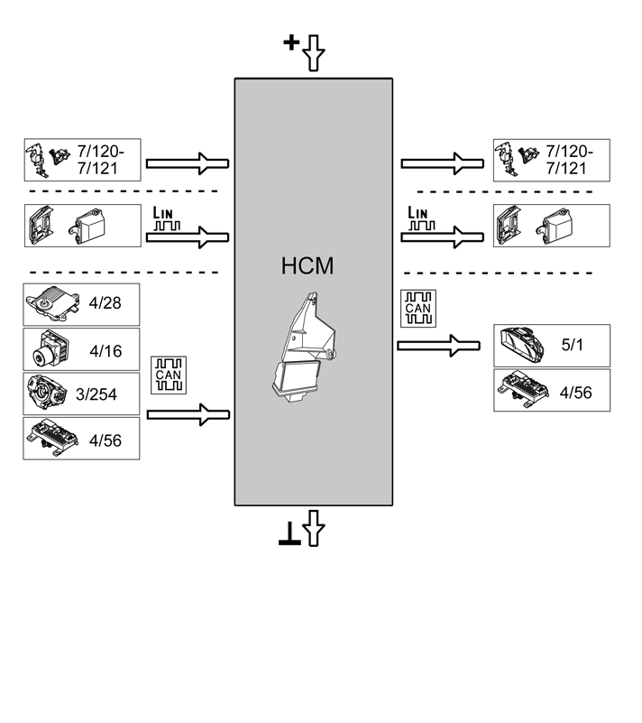 The table below summarizes the input signals to and output signals from the headlamp control module (HCM). The signal types are divided into directly connected signals, serial communication and CAN communication. The illustration below (see Fig 1) displays the same information with the Volvo component designations.