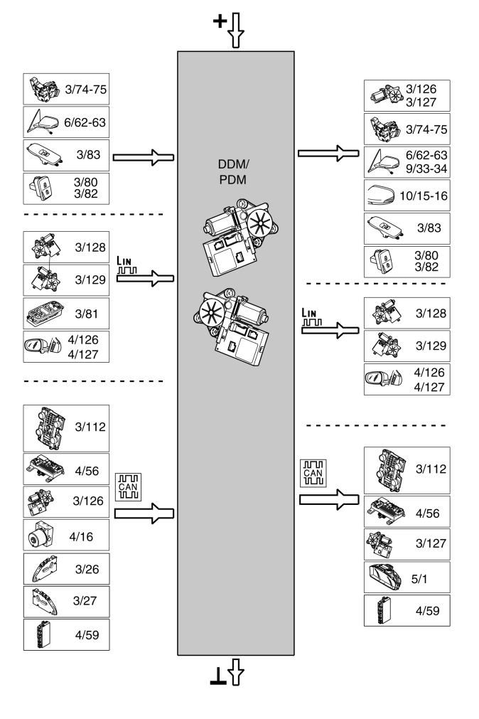 The table below summarizes the input signals to and output signals from the driver door module (DDM) and passenger door module (PDM). The signal types are divided into directly connected signals, LIN and CAN communication. The illustration below (Fig 1) displays the same information with the Volvo component designations.