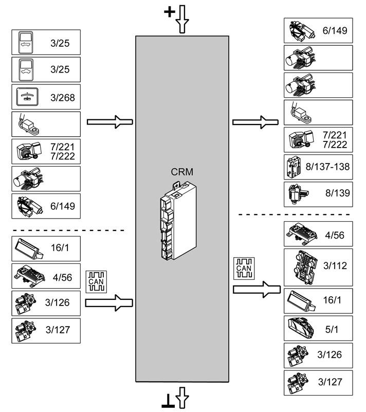 The table below covers input and output signals to and from the Convertible Roof Module (CRM). The signal type is split into directly connected signals and CAN communication. The illustration below (Fig 1) provides the same information with Volvo's component designations.